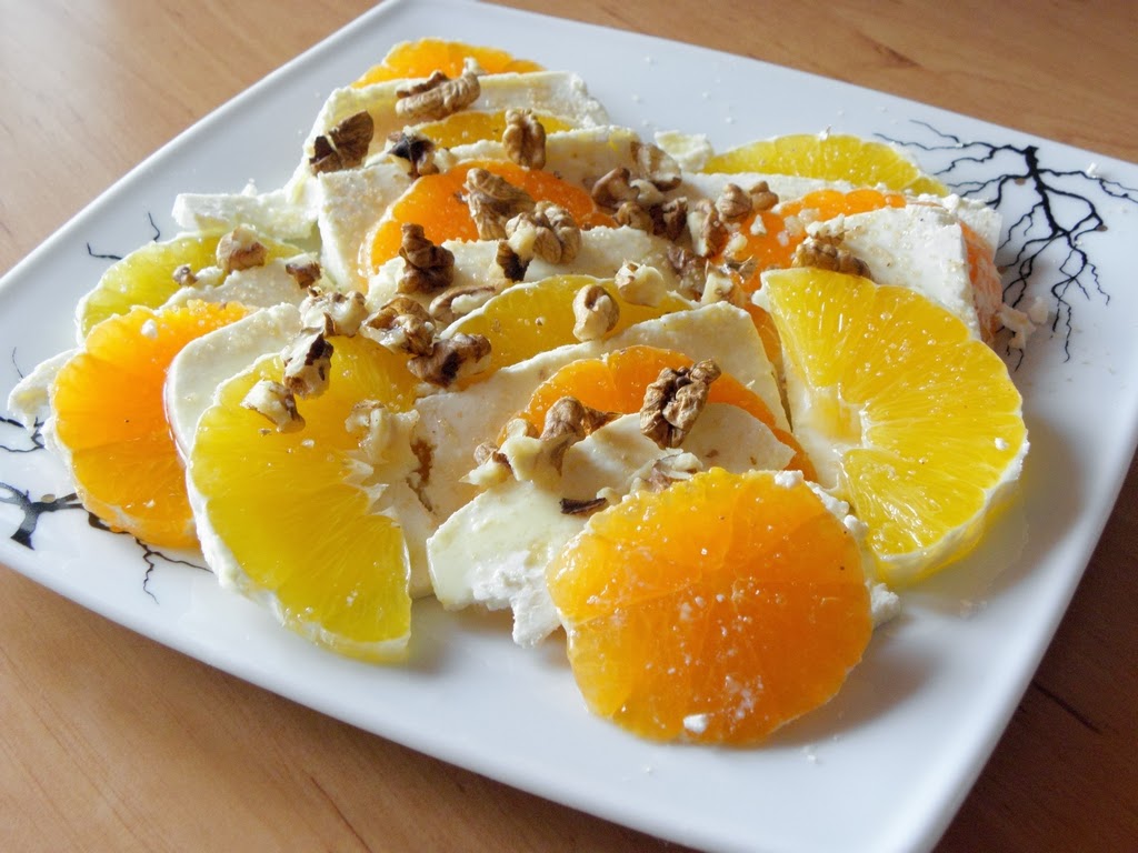 Pomarańczę i mandarynkę obrać, orzechy posiekać na mniejsze kawałki. Owoce i twaróg pokroić w plastry i układać warstwami na talerzu. Całość polać miodem, zasypać cukrem cynamonowym i orzechami. Polecam skruszyć domowe pierniczki świąteczne, pasują idealnie! ;)